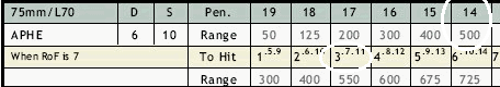 The above is part of the German 75mm/70 gun table, the gun on the Panther tank. The row titled 'To Hit' lists the numbers needed to score a hit. The first number and biggest number is the base to-hit number. The smaller numbers separated by dots are the number needed for two or three hits. Looking at the column listed 3.7.11 with 550 listed under it in the 'Range' row. This means if a 3 was need for one hit, then a '7' is needed to get two hits and '11' is needed