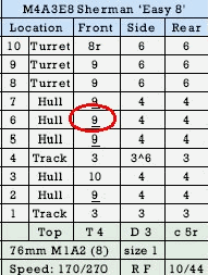Tank table for a Sherman M4 'Easy 8'. Location 6 on the front has 9 underline armor. The underline means it is highly sloped